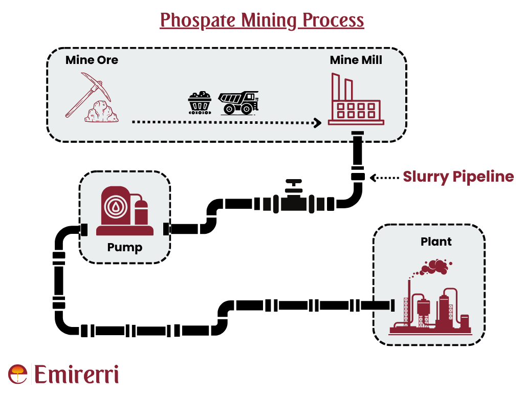Phosphate mining relies heavily on slurry pipelines due to the unique nature of phosphate rock processing. In phosphate mines, the raw material is crushed and mixed with water to form a slurry, which is then transported to processing plants. This method is particularly efficient for: